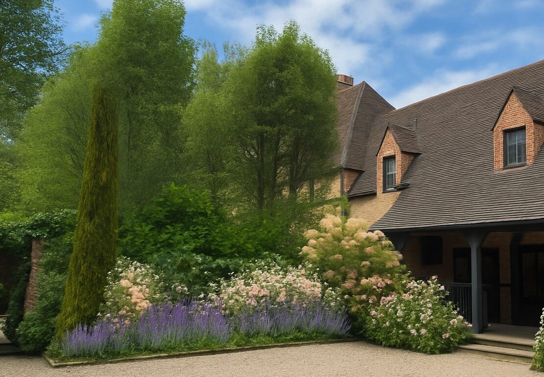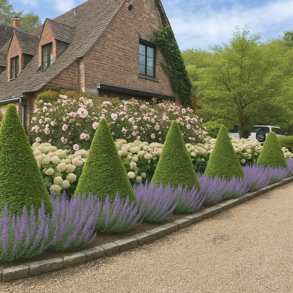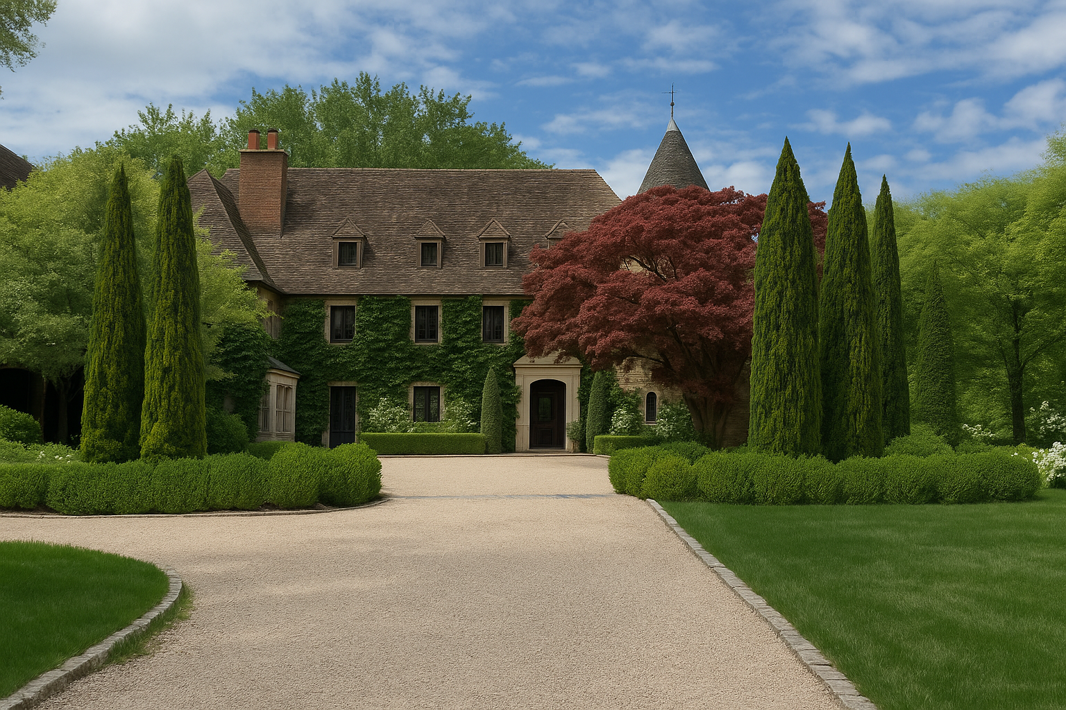 A classic Norman-inspired house on Long Island—shaped by echoes of Normandy and a broader European lineage (England’s garden rooms, Italy’s formal rhythm)—finds its counterpart in a landscape that is both structured and deeply alive. The approach is choreographed with evergreen punctuation and clipped forms, guiding you into a sequence of outdoor “rooms” where architecture and planting speak the same language. A diverse, layered plant palette builds depth and seasonality—hydrangeas, roses, lavender, nepeta, flowering trees, and meadow-like perennials—while topiary, allees, and crisp edges hold the composition with quiet rigor. The result is a garden of texture, fragrance, and long bloom, tailored to the house yet responsive to Long Island’s light and seasons.